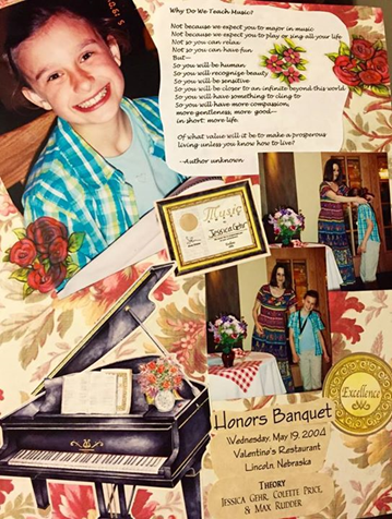 Jessica played piano from her Kindergarten year until she entered high school under the tutelage of Ceil Brown, 1953- 2010. Ceil learned to play piano from Marie Ducey, who she spoke of so highly. Marie Ducey took piano lessons from James Madison Tracy, 1837-1928.  Tracy and his wife established the Liszt School of Music in Denver in 1910, named in honor of his piano teacher, Franz Liszt.