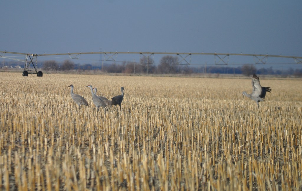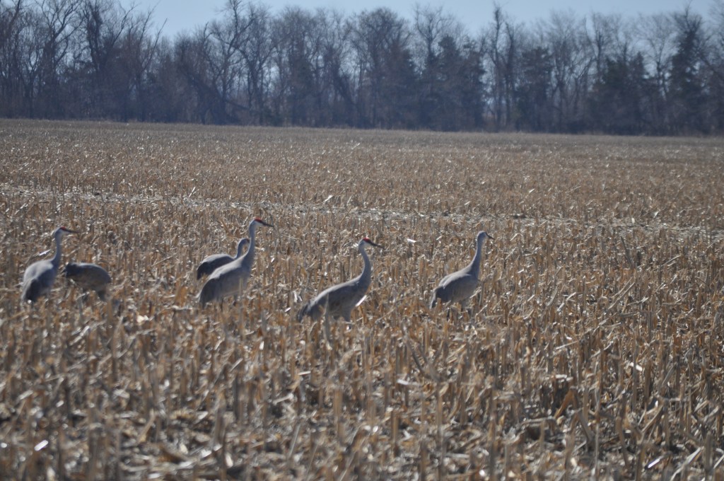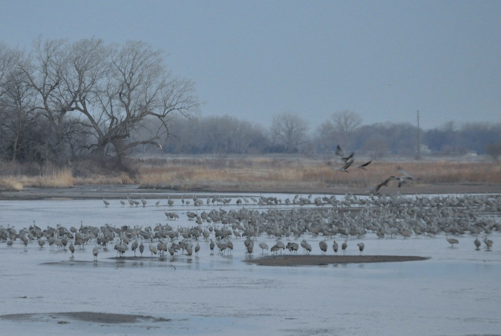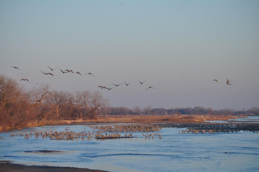 The Sandhill Crane has used the Platte River Valley for some 10,000 to 12,000 years, following the end of the last ice age, as a layover on their migration to breeding grounds as far north as Alaska and Eastern Siberia. The sandbars on the Platte River provides rest and refuge for the crane and the farm and wetlands provide sustenance for the remainder of their journey.