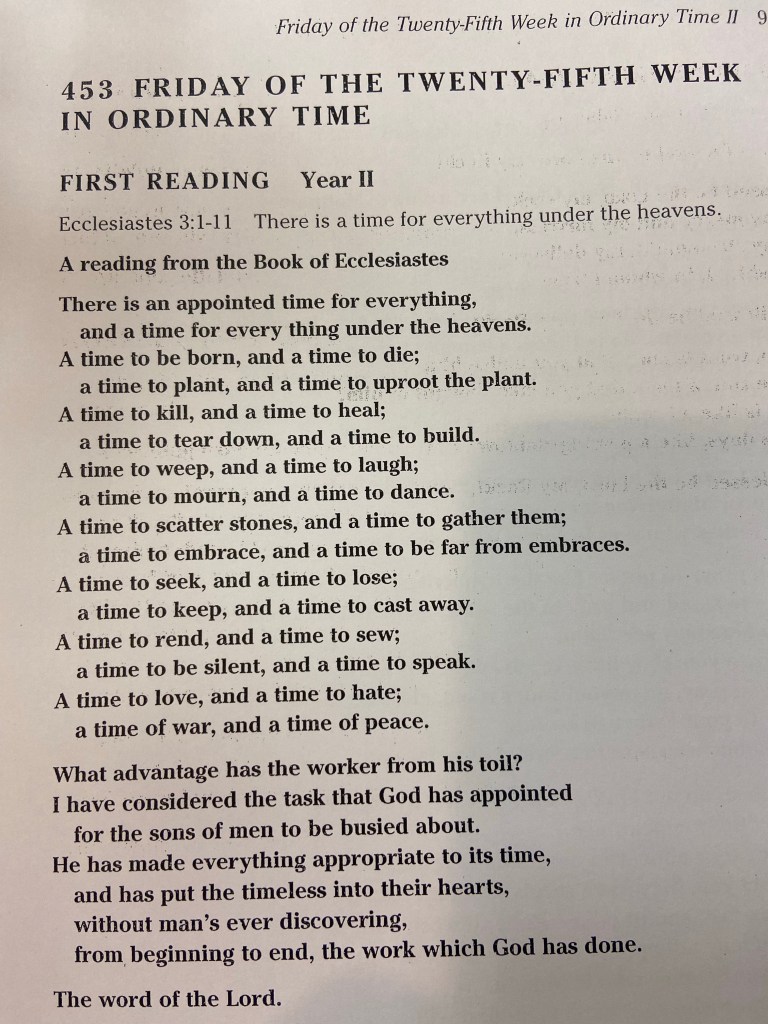 Much as happened, we can assume, in each of our lives. Knowing this, we can give ourselves and others compassion when we feel we are falling short, when we don’t meet the expectations we have placed on ourselves. Each of us has a story. There is a time for everything, and how wonderfully TIMELY is our lectio reading for today: