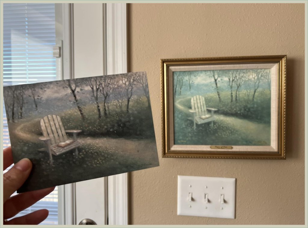 Indeed, it did, and a giddy feeling of serendipity! I love the image on the card so much that some twenty years ago I purchased a signed and numbered canvas of it titled “Pages of Time” by Gene Roncka and it is hanging in my kitchen!