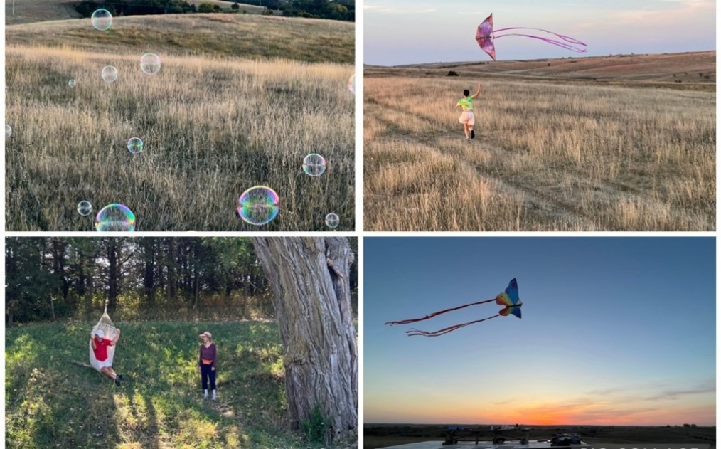Being silly before breakfast, we played with morning shadows, losing all sense of time. On a tractor-pulled hayrack, we rode up the hill and into the pasture to play—blowing bubbles, flying kites, and watching the sunset and the rise of the Full Harvest Moon. We danced in the moonlight to moon songs (think Fly Me to the Moon and Blue Moon), gazed at the stars, shared stories, reflected on the past, and imagined the future. How blessed we are to enjoy time in nature, on land that is loved and shared so generously.