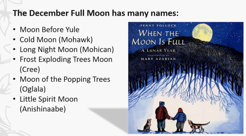 Recently, I led a Full Moon Soulfully You retreat with kindred spirits. We celebrated the diversity of names for the moon and read the endearing children’s book “When the Moon Is Full” by Penny Pollack.