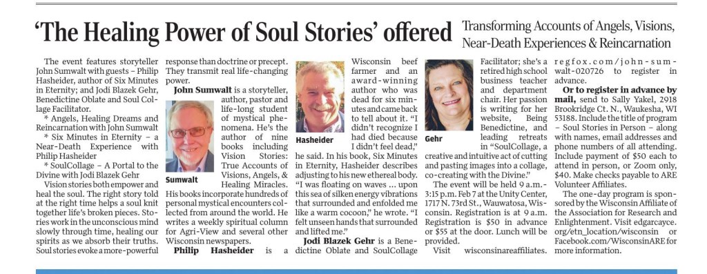 John and I have stayed in touch since then, sharing our interests, writing, and travels. I am honored that he asked me to collaborate on a retreat day called “The Healing Power of Soul Stories” at the Unity Center in Wauwatosa, Wisconsin, on Saturday, February 7. The one-day program sponsored by the Wisconsin Affiliate of the Association for Research and Enlightenment includes presentations and sharing sessions led by John Sumwalt , Philip Hasheider, and myself (see article for bios.)