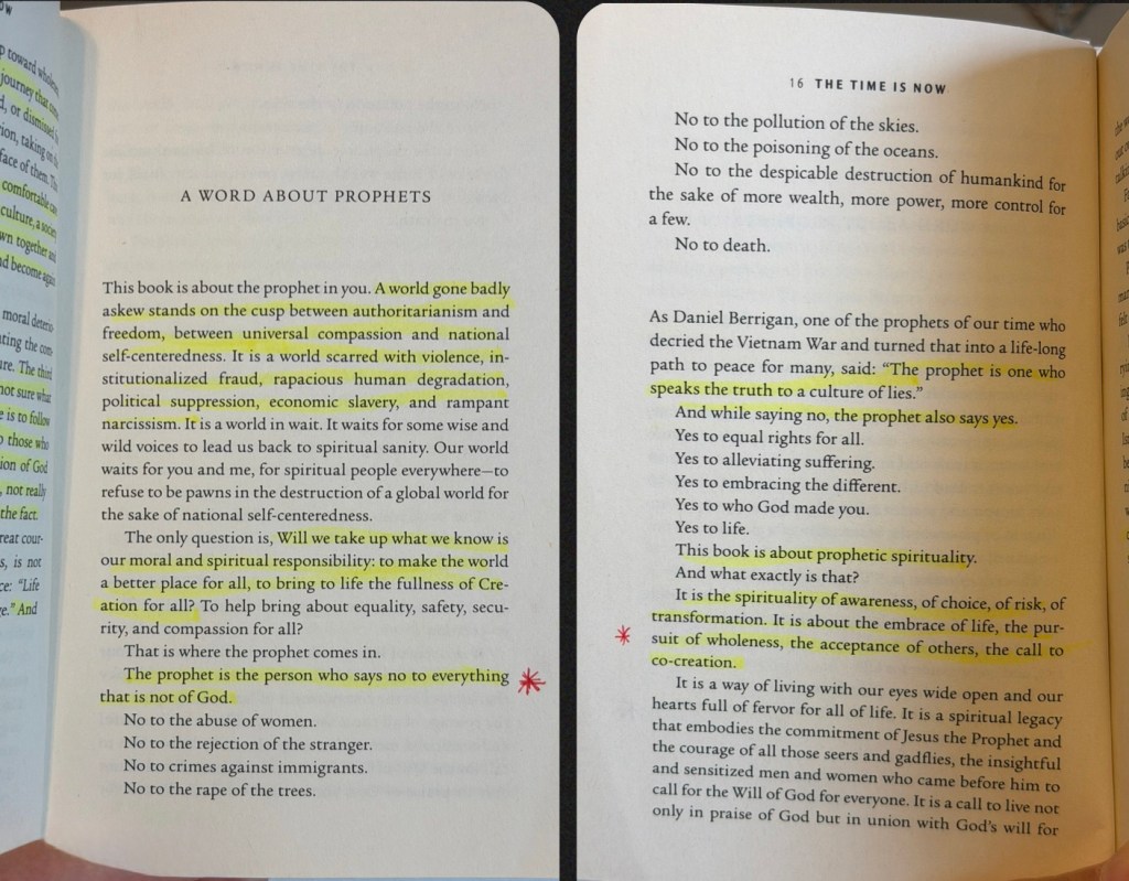 What is a prophet? Chittister writes, “The prophet is the person who says no to everything that is not of God...one who speaks the truth to a culture of lies.” It’s also saying yes— yes to equal rights, alleviating suffering, embracing diversity, and to prophetic spirituality, (and, lol, to highlighting the best parts of a book. Yes, I travel with highlighters and have them readily available in every room of my house. Chittister writes highly highlight-able books.)